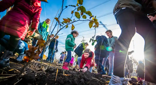 Neighborhood “mini-forests” (200+ diverse trees/shrubs each) at schools, parks, and faith centers—cooling cities, boosting biodiversity, and growing perennial food.